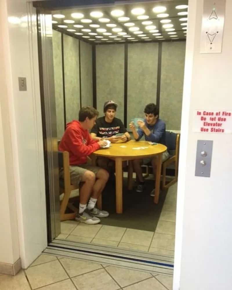However, in a noteworthy departure from the usual elevator escapades, a group of college boys boldly elevated the art of elevator entertainment to new heights. With an audacious flair, they transformed the otherwise mundane elevator cabin into a vibrant and fully-equipped gaming hub, complete with a table and chairs. This unconventional setup turned the elevator into an intimate den of leisure, a stark departure from the ordinary and utilitarian nature of this vertical transportation system.