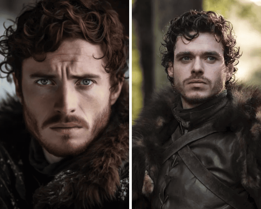 Richard Madden’s striking resemblance to the AI’s imagined depiction of the eldest Stark child, Robb Stark, is uncanny. Nevertheless, a few small inaccuracies should be noted. Firstly, like the rest of the Stark children, Robb was aged up in the show, transitioning from 14 to 17.