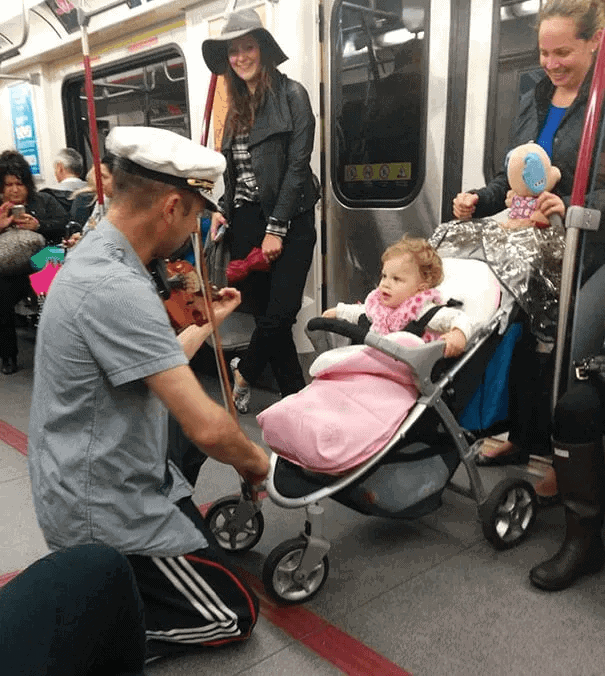 An empathetic boat captain harnessed the power of music, captivating the toddler’s attention with a fiddle performance. As the instrument’s notes resonated, the child’s tears transformed into rapt fascination, offering a harmonious solution amidst the subway cacophony.