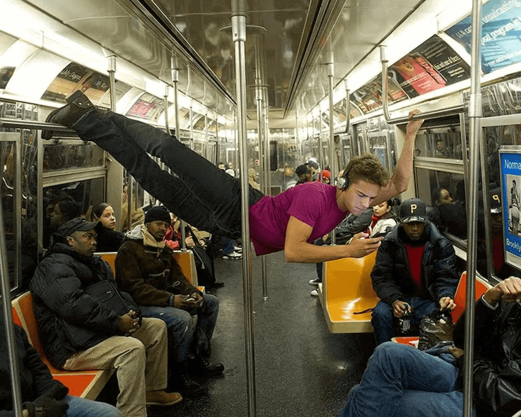 As he dangles amidst the stares of bemused onlookers, his suspended position adds an element of awkwardness to the already bustling subway environment, prompting contemplation about the motives behind his unorthodox choice.