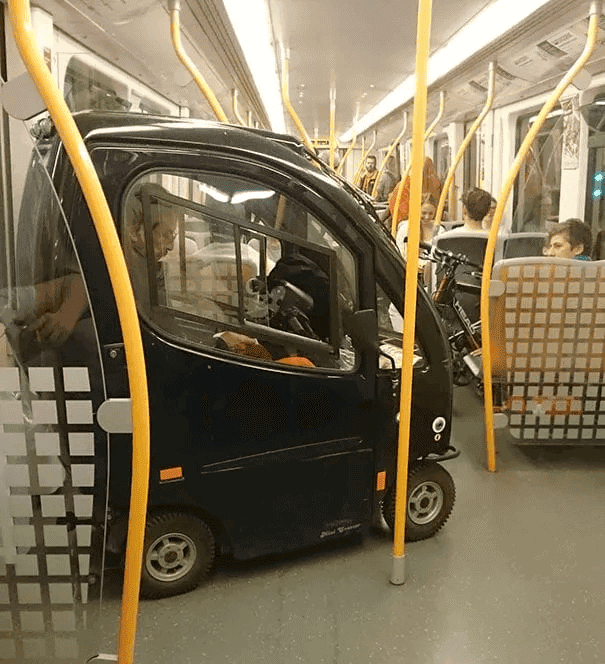At first glance, the owner of this Smart Car might appear perplexing – after all, why bring a car onto the subway? Yet, a closer look reveals some practicality in the decision. The car offers personal temperature control and protection from any potential subway mishaps if the battery holds up.