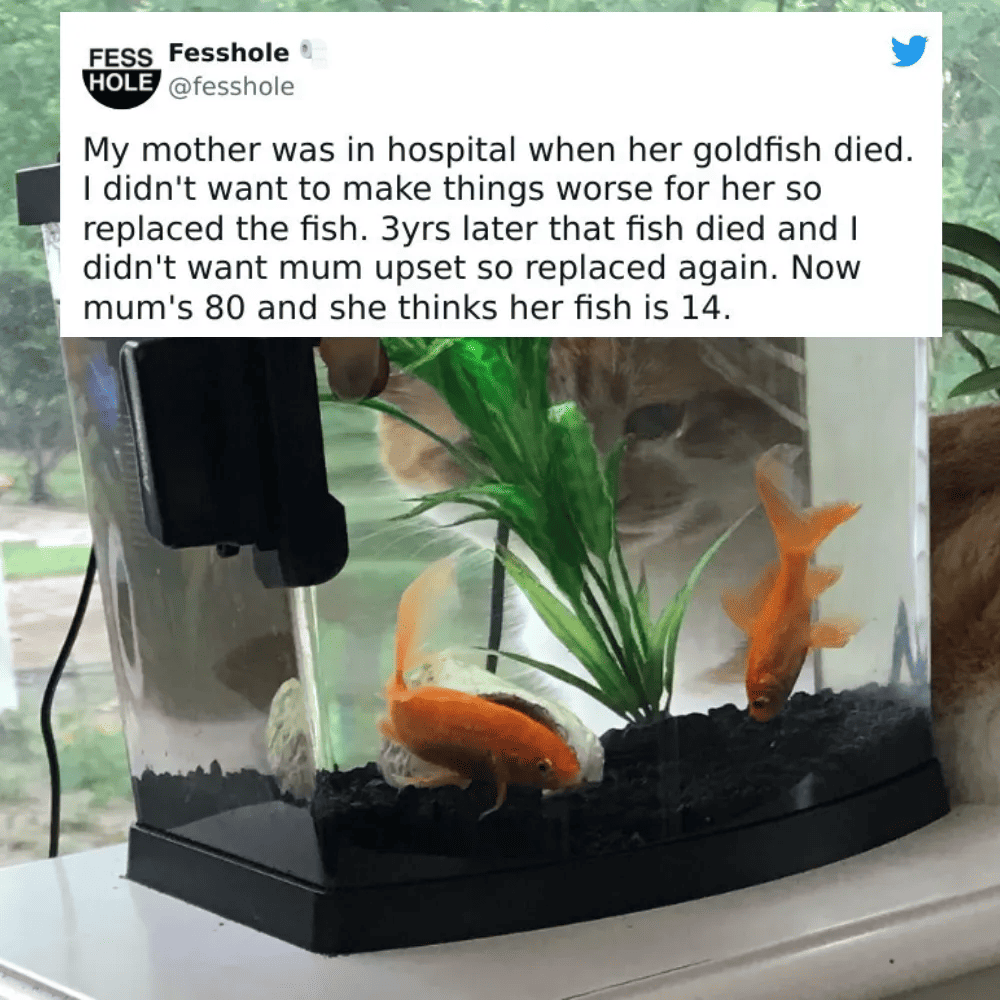 This woman’s response to the goldfish situation raises two intriguing possibilities: she might genuinely misunderstand fish life cycles, or she graciously plays along with her child’s imaginative fib while appreciating the sentiment behind it. In her eyes, the goldfish becomes an endearing symbol of unwavering loyalty, a companion that has stood by her through the highs and lows of life, remaining resilient in sickness and robust in health, across the span of numerous years.
