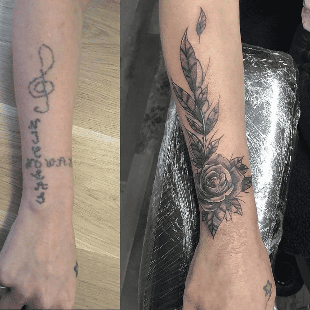 In a bold move, they created a design featuring a rose encircled by leaves and vines, ingeniously covering every part of the old tattoo, including its shaky linework. The result is a captivating and beautiful tattoo that seamlessly conceals the previous ink, offering a unified and visually striking piece.