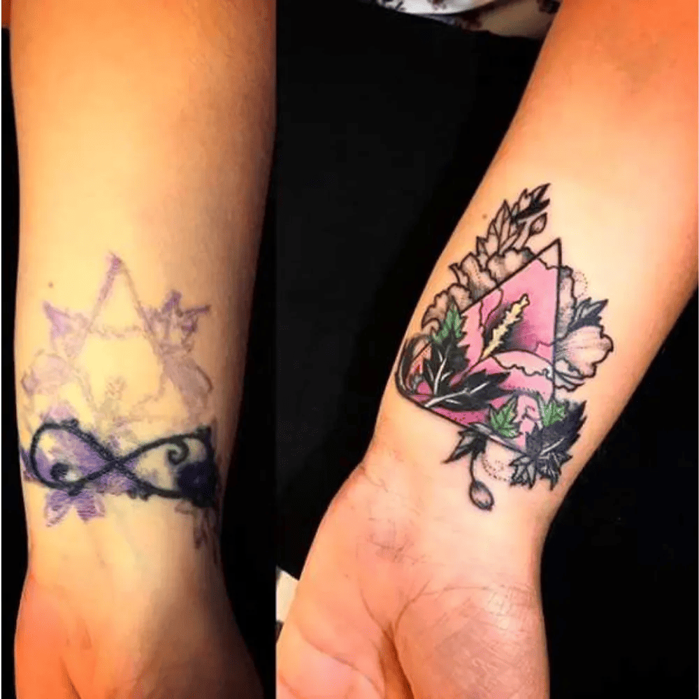 In this tattoo, the tattoo in question illustrates a graceful departure from the past. The original solid black infinity symbol underwent a remarkable transformation within it, emerging as a vibrant and captivating focal point within a broader, more intricate design. This fusion of vibrancy and monochromatic elements is a testament to the artist’s adeptness in navigating the shifting tides of tattoo fashion, offering a fresh perspective on a once-beloved symbol.