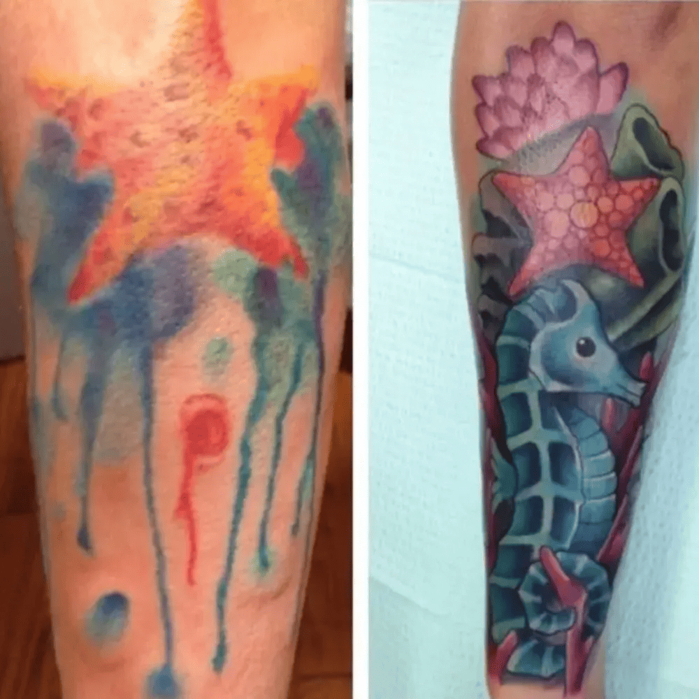 In the case of this particular tattoo, the initial attempt failed to meet the individual’s expectations. It’s understandable, given that the poor starfish resembled a melting figure rather than a vibrant marine creature. To address this, a coverup was in order, resulting in a more recognizable and endearing scene of life underwater. This time, a friendly seahorse joined the marine tableau, adding an element of charm and character to the tattoo, turning what was once a regrettable ink into an enchanting work of art.