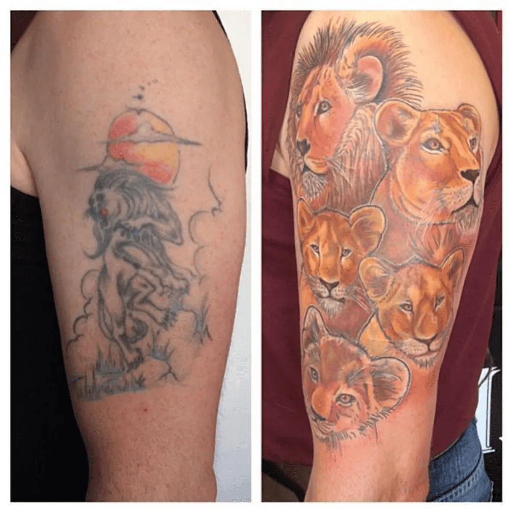 The initial lion tattoo in this story lacked the strength and fierceness one would associate with this majestic creature. Rather than shying away from their original idea during the coverup, the individual decided to double down on the concept. In doing so, they replaced their old tattoo with a pride of lions. The transformation was undeniably an improvement over the first attempt, resulting in a tattoo that they would be proud to showcase, showcasing the power of perseverance and the transformative potential of tattoo artistry.