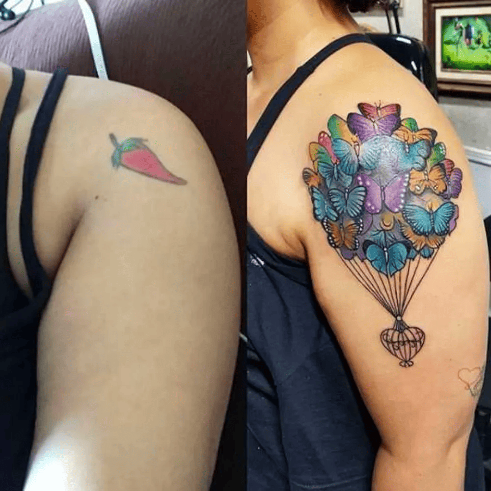 This dream became a reality through the skill and artistry of their chosen tattoo artist. Instead of a lackluster hot pepper, the space on their shoulder became home to a stunning cluster of butterflies. These vibrant and impeccably tattooed butterflies replaced the mundane original, breathing new life into the canvas and demonstrating the artist’s ability to elevate a concept from ordinary to extraordinary.