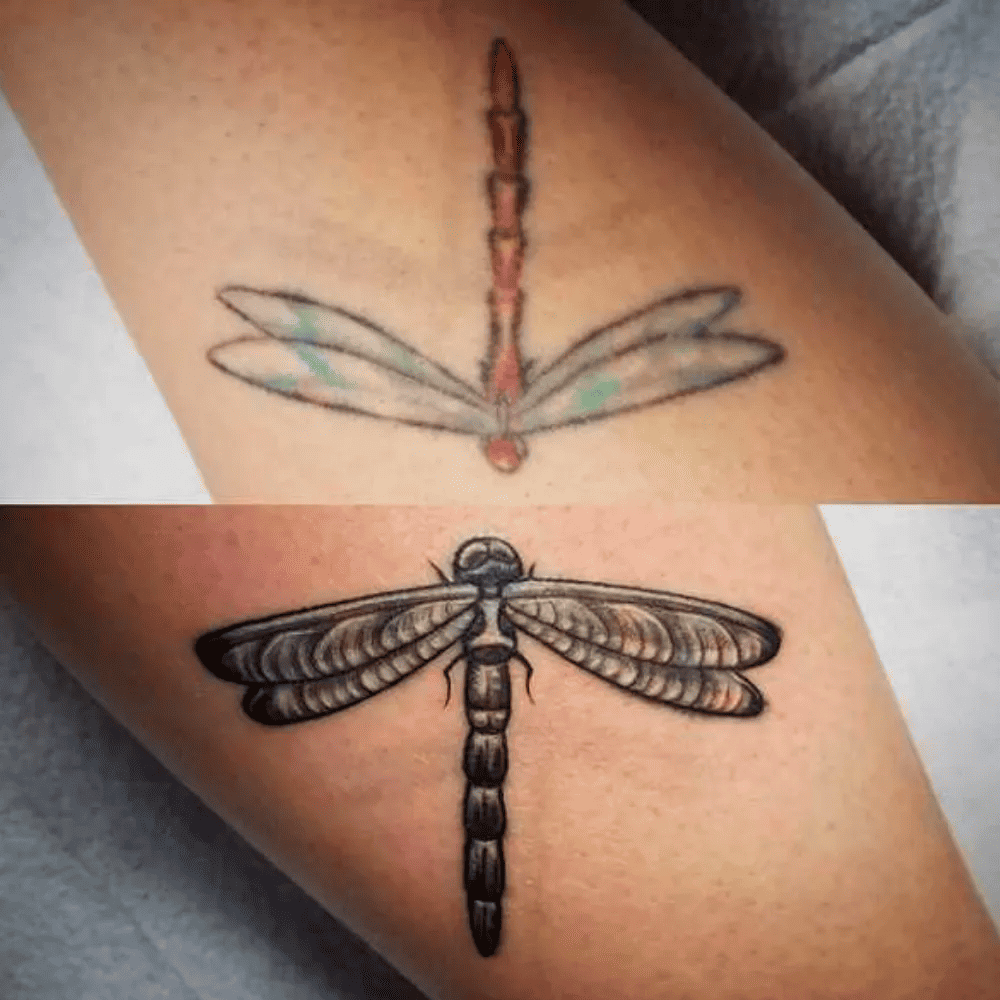 In this case, the artist and the client agreed to the original theme—a dragonfly. The artist opted for a black-and-white rendition to effectively obscure the old tattoo, which was originally executed in vibrant colors. An intriguing aspect of this transformation is the glossy appearance of the redefined wings, an effect achieved by strategically incorporating the underlying cover to enhance the overall aesthetic.