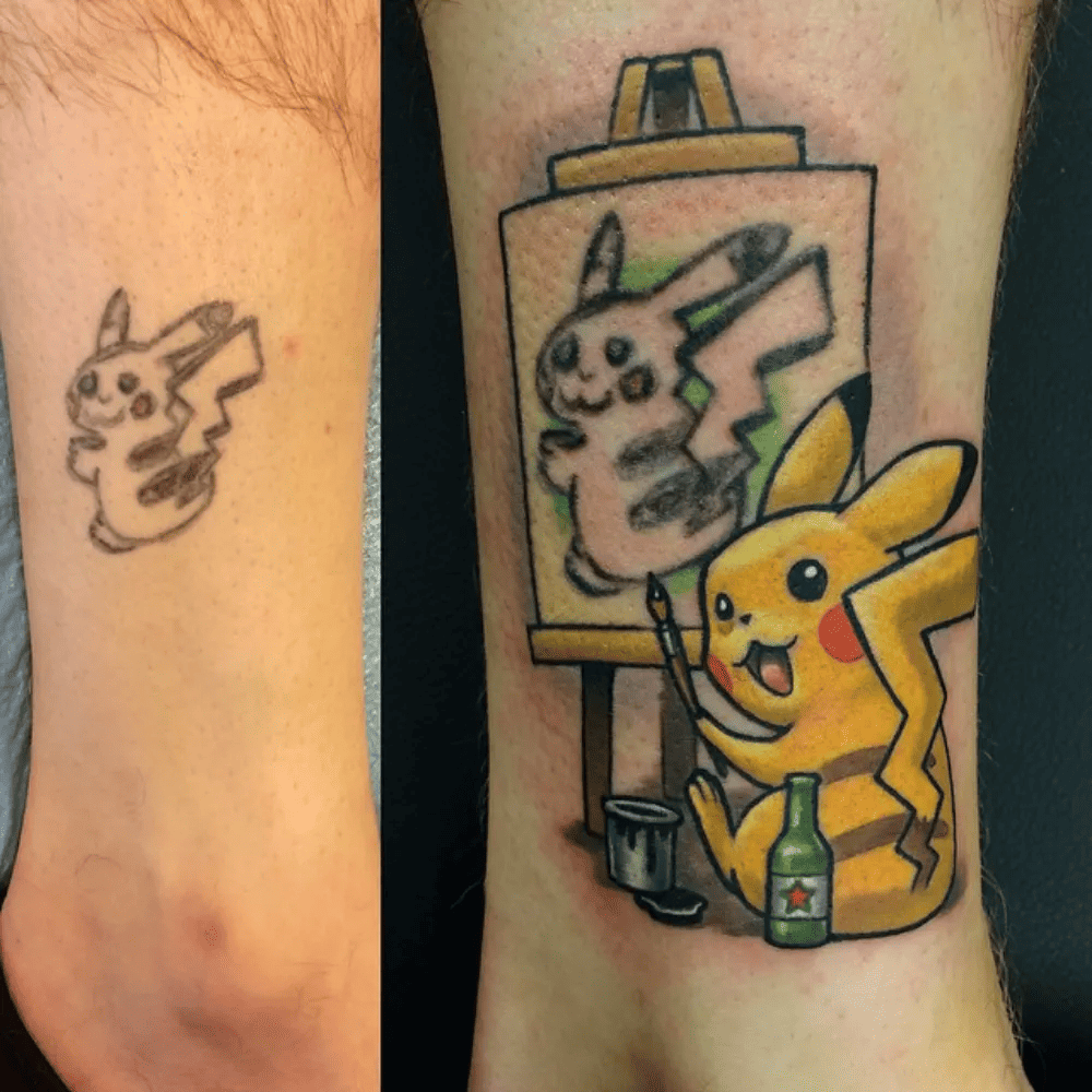 In this instance, the artist hid the original Pikachu in plain sight. Rather than overlaying it with a new rendition, they incorporated a second Pikachu into the design, effectively capturing the old one within a new artistic canvas. This approach covers the original tattoo and adds an intriguing layer of narrative to the artwork.