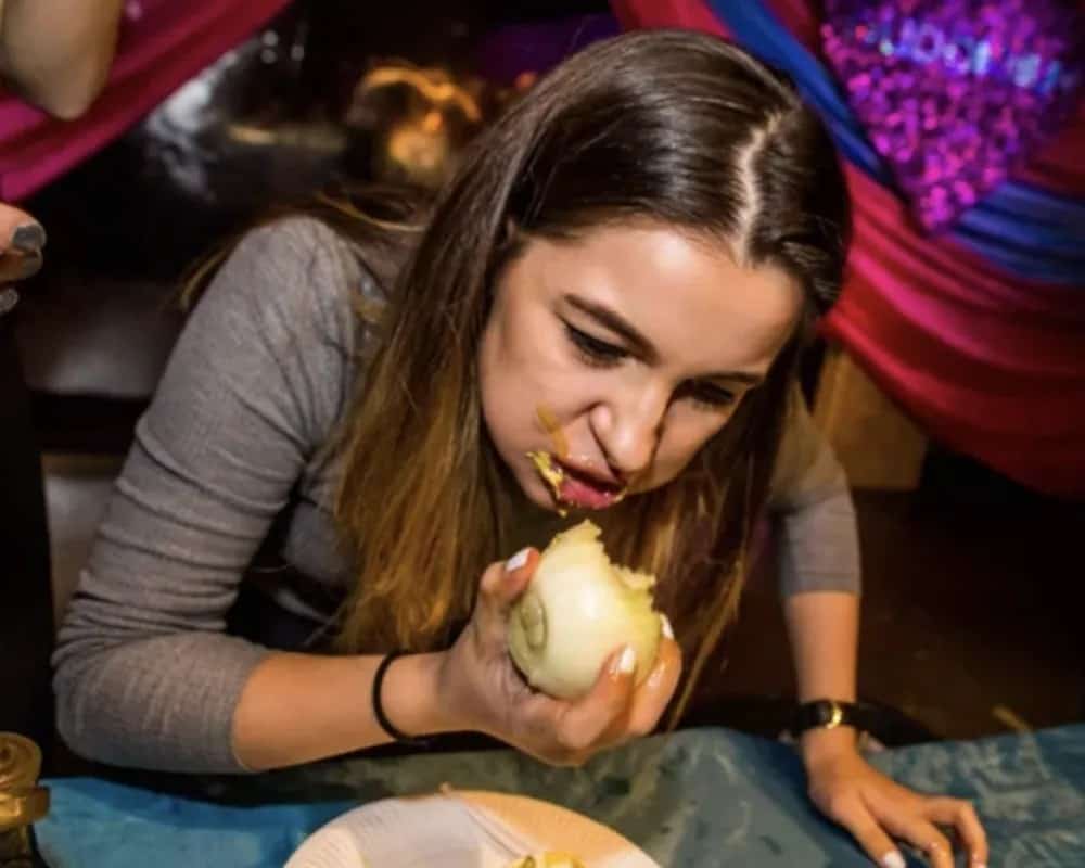 In this peculiar scenario, it’s safe to assume that the person in question was likely engaging in some sort of unique challenge or dare. Their choice of snack leaves no doubt that this isn’t a typical midnight indulgence, as they are seen consuming a raw onion slathered in mustard.