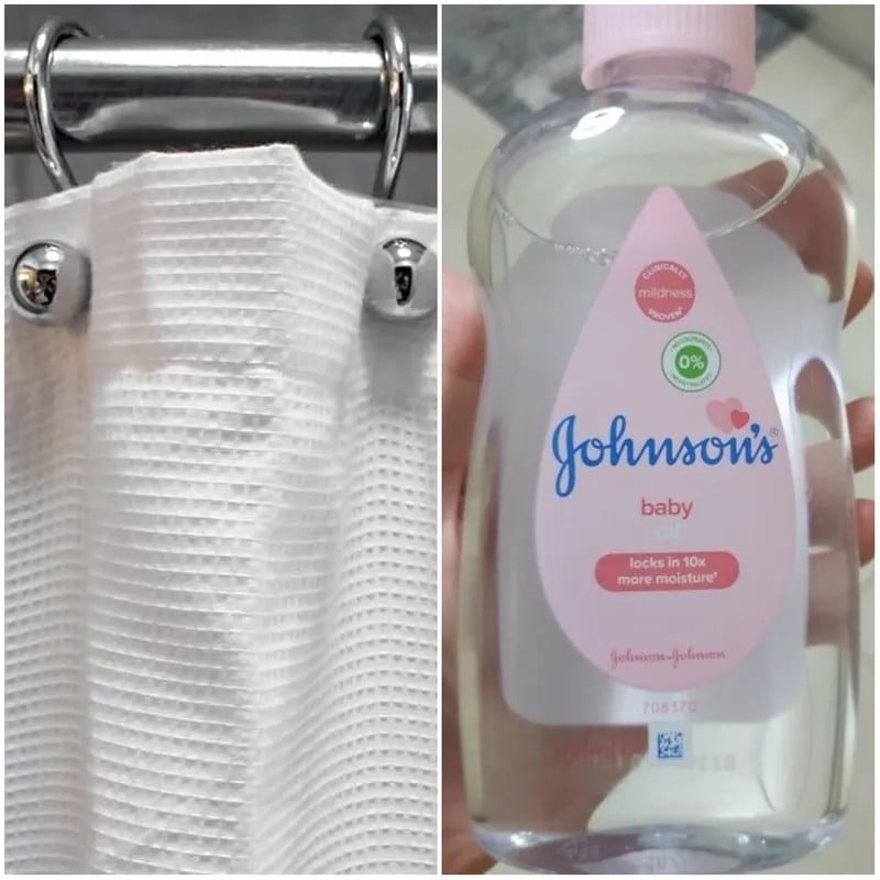 Thankfully, baby oil can help. Just apply some onto a cloth and wipe it over the curtain to eliminate mildew, restore color, and maintain freshness, extending its lifespan.