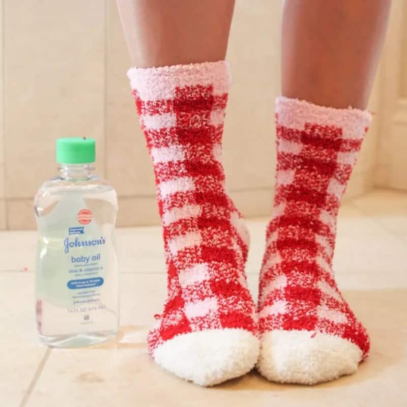 While baby oil is effective for cracked ankles, why not treat your entire foot? Simply slather your feet in baby oil and put on a pair of socks.