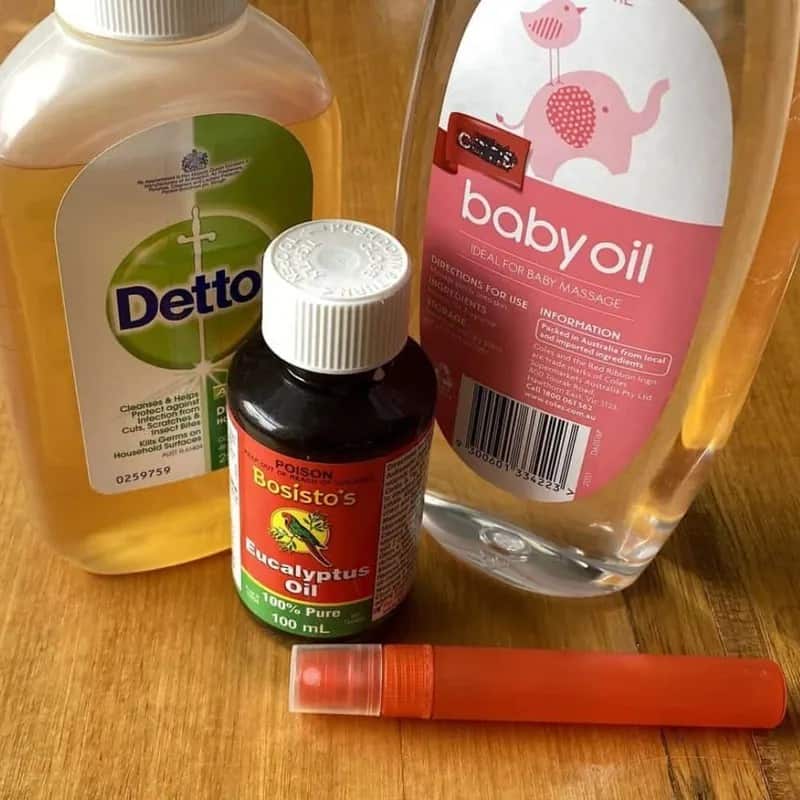 Surprisingly, baby oil can repel bugs without the medicinal scent of commercial sprays. Create your bug repellent by mixing equal parts eucalyptus or tea tree oil, baby oil, and an antiseptic like Dettol.