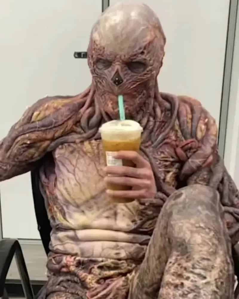 This is precisely why we occasionally come across intriguing images like the one featuring Jamie Campbell Bower, who, while on the set of Stranger Things, took a coffee break while fully dressed as a grotesque creature.