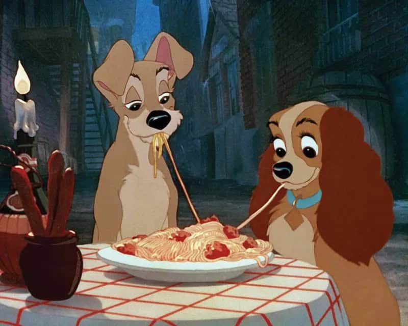 The Lady and the Tramp’s famous spaghetti-eating scene is unforgettable in this cherished tale of canine romance.