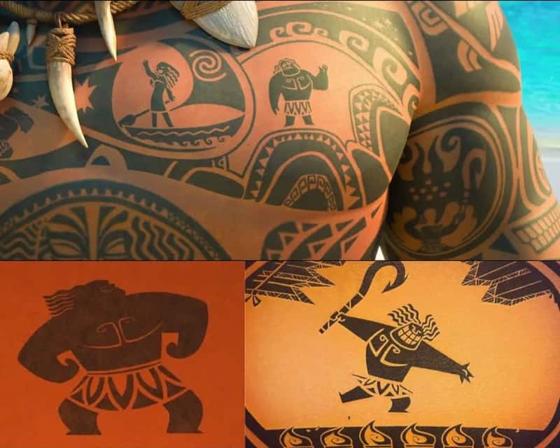 In Moana, the chief’s daughter meets Maui, a demigod with a magical fish hook and tattoos depicting his feats.