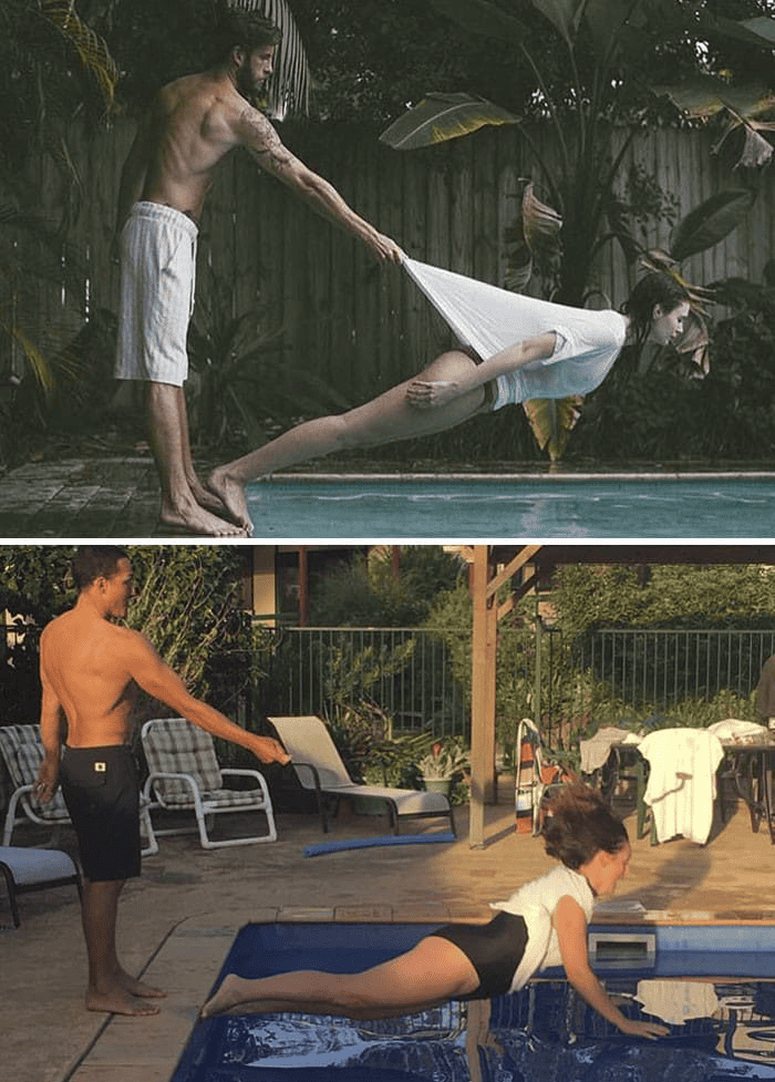 Which version of the trust fall do you prefer? We might lean toward the classic one. Taking a dip in the pool is fine, but not via a splash landing! Do you think this trust fall requires a certain degree of muscle strength, or did Celeste’s partner intentionally let her take the plunge?