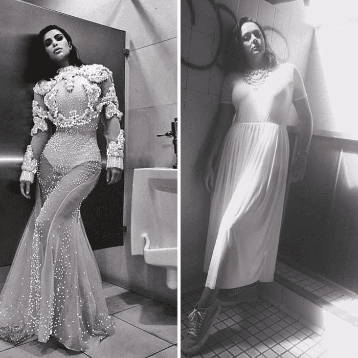 At least Celeste didn’t recreate the scene with a urinal in the frame. However, you can tell from the graffiti on the wall that it’s some sort of bare bathroom setting. She pairs the loose dress with a cluster of pearls and sneakers. It doesn’t exude the same vibe as Kim K’s dress, but it’s got its edgy charm.