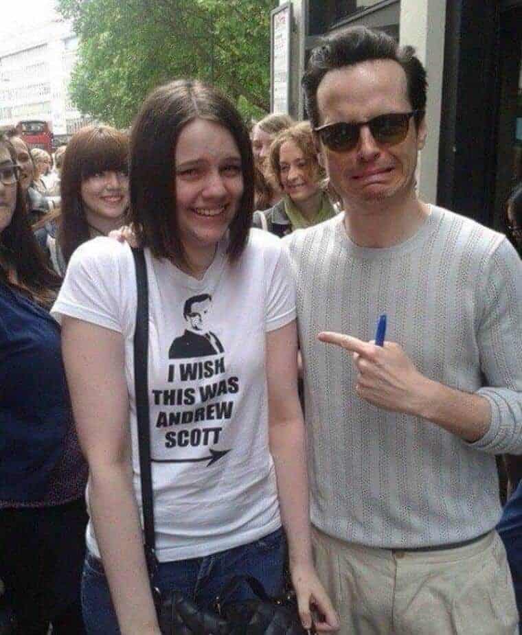 It’s not very often that a piece of clothing turns out precisely how you imagined it would when you put it on, but when it does, it’s a pleasant surprise. The young supporter’s dream came true, and she was so astonished when it did happen that she nearly didn’t believe it. She took a gamble by wearing a blouse that said, “I wish this were Andrew Scott,” She was rewarded with realizing her wish. Her shirt inscribed, “I wish this were Andrew Scott.”