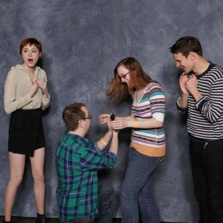 It’s one of those unusual situations in which the audience members are more interested in watching than the celebrities performing on stage. It is accurate to say that Matt Smith and Karen Gillan from Doctor Who are photobombing a guy while he is asking his fiancée to marry him.