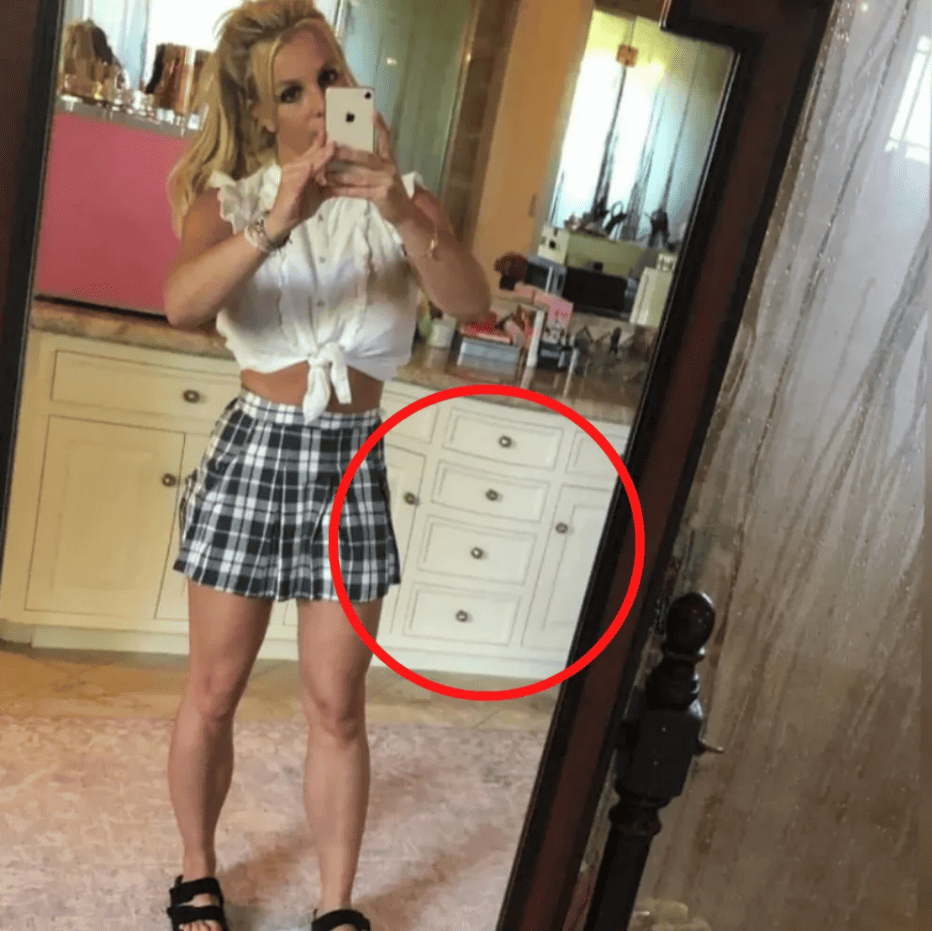 The drawers behind her exhibit conspicuous distortion, revealing clear evidence of digital manipulation. To dispel any doubts about the possibility of it being an oddly shaped dresser, it’s worth noting that Britney has posted numerous other photos in front of the same piece of furniture, none of which displayed such distortion before.