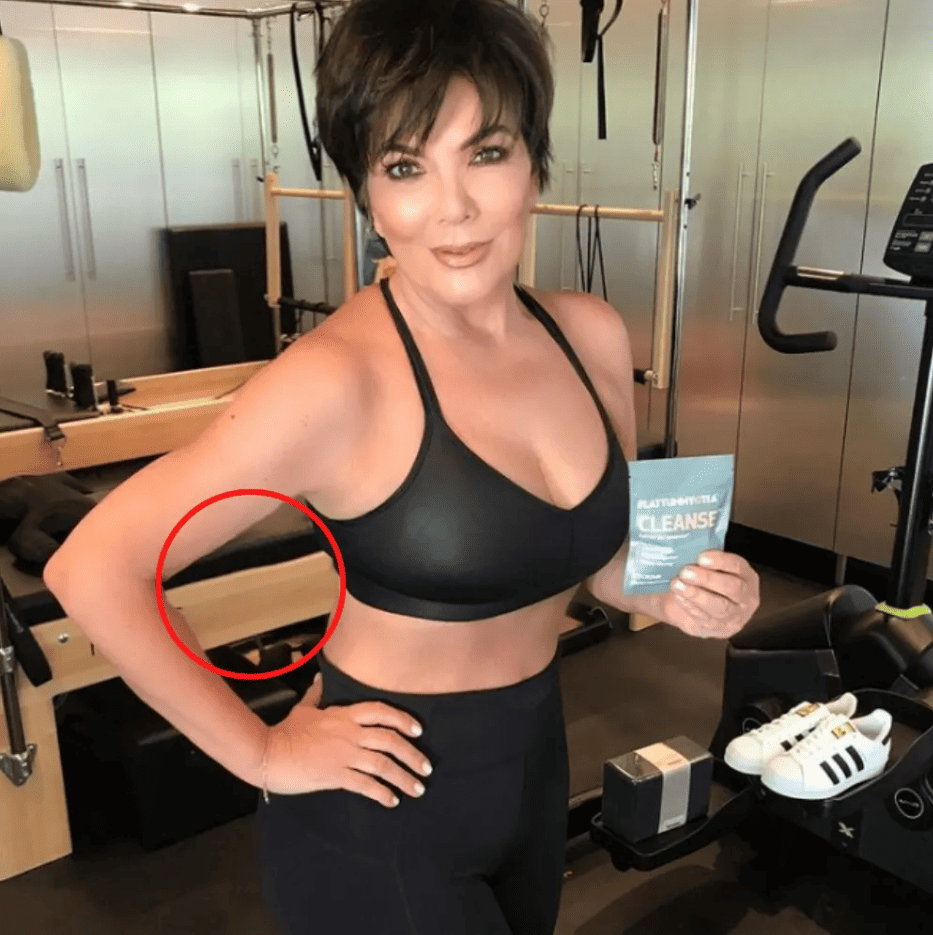 Kris Jenner took to social media to promote the supplements she claims to use, but keen-eyed fans quickly noticed some artificial assistance in this photo. The gym equipment behind Kris’s right arm appears distorted and out of proportion, strongly suggesting that she has manipulated the shape of her arm and waist in the image.