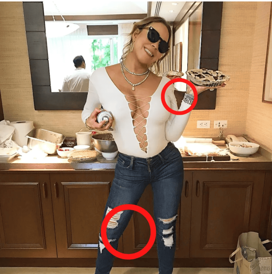 The telltale signs are there – the distorted mirror indicating changes to her left arm and chest and the wavy cabinet near her right leg, a clear indication of slimming down her lower body. Perhaps Mariah should consider sticking to baking, as that pie does look delicious! Unless, of course, that was photoshopped too.