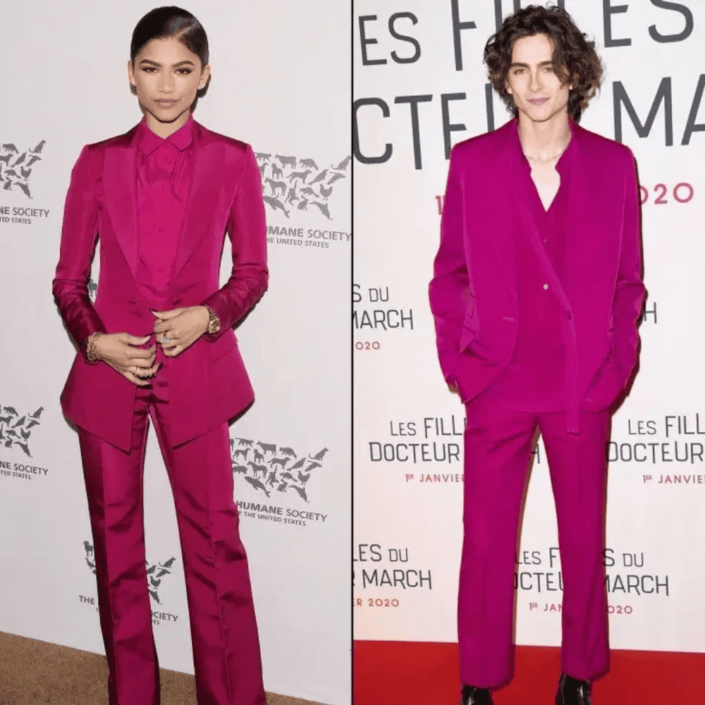 Stars of the hit show Euphoria, Zendaya, and Timothee Chalamet seem to share a similar style when it comes to red-carpet events. Zendaya wowed in a stunning fuchsia Christian Siriano suit at a Humane Society event a few years ago. Inspired by her bold and stylish look, her co-star Timothee Chalamet opted for something similar, sporting a hot pink suit by British fashion designer Stella McCartney. Both celebrities showcase impeccable style.