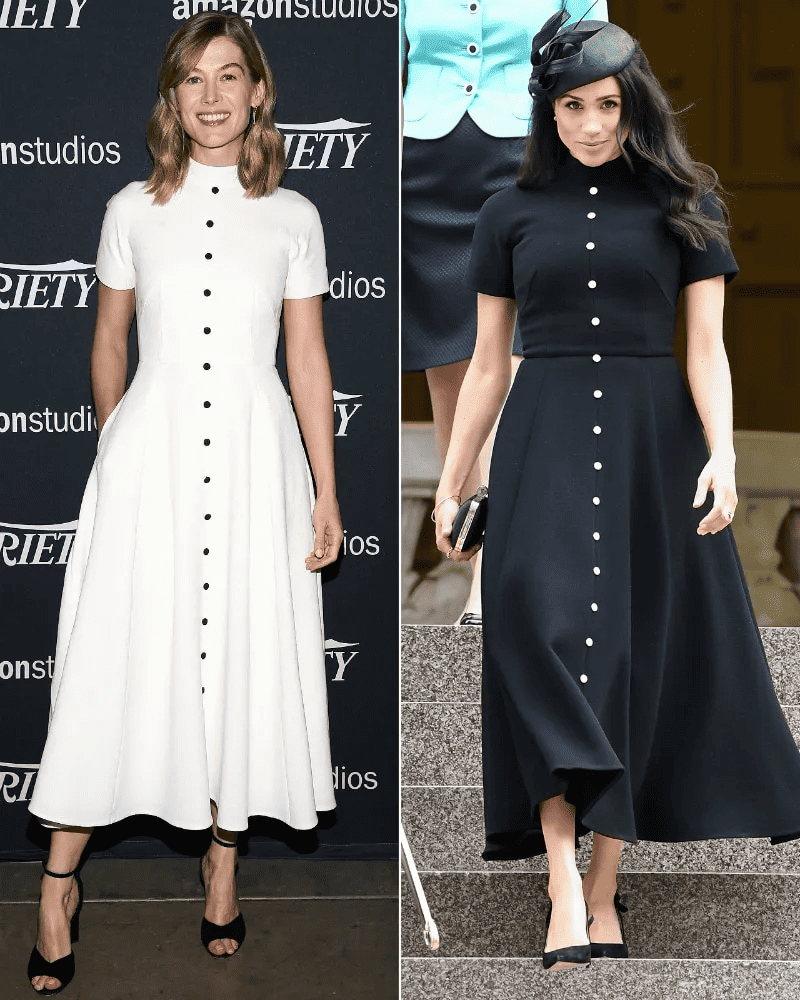 In a fashion faceoff, Rosamund Pike and Meghan Markle showcased their elegance in a button-down dress by Emilia Wickstead. Meghan chose the black version, pairing it with a stylish hat and a matching pocketbook for a royal event. In contrast, Rosamund opted for the white version without additional accessories. Both dresses feature a flattering button-down front design and cinched waist, making choosing the superior look among these monochromatic twins difficult.