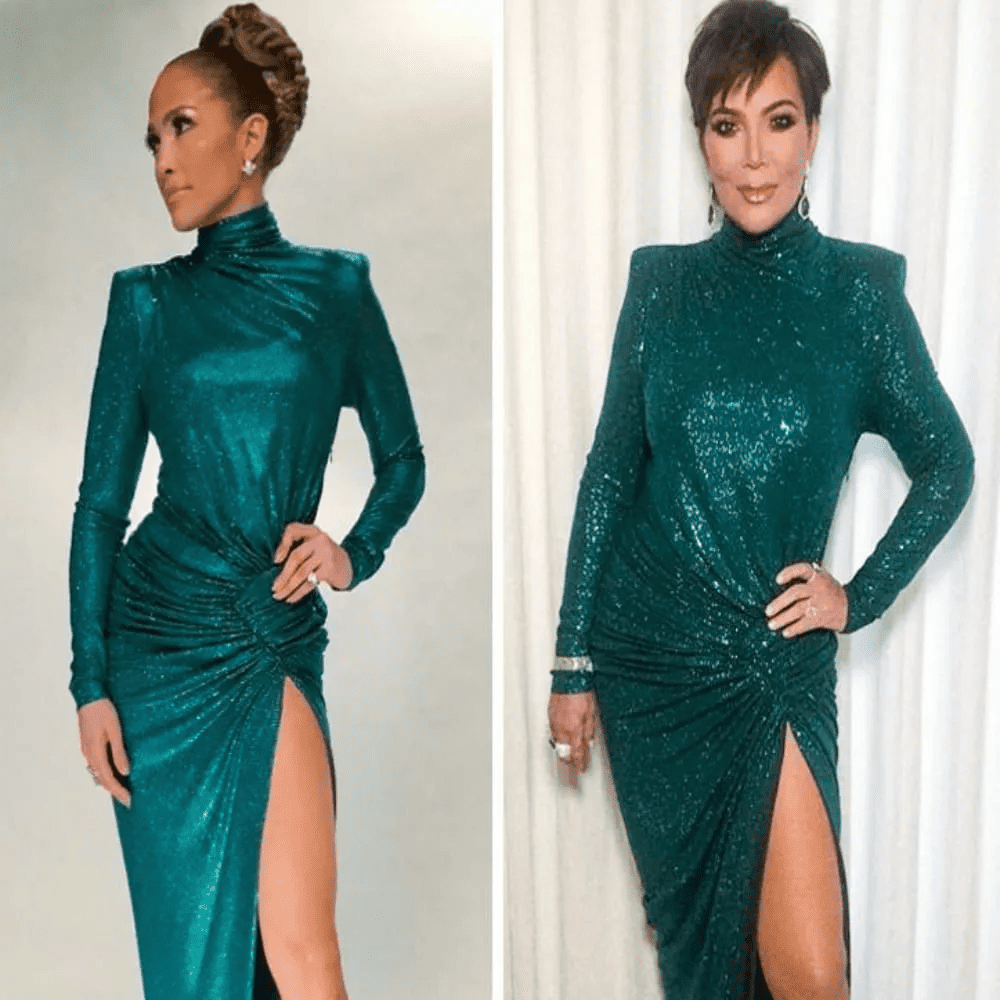 A dress designed to steal the spotlight, with its high neck, long sleeves, and long skirt, brings a touch of conservative elegance. Yet, the daring slit up the side and the glittering finish ensure all eyes are on you. Jennifer Lopez and Kris Jenner both chose to rock this attention-grabbing dress. J Lo paired it with an intricate updo and simple earrings, while Kris opted for more dazzling jewelry, including rings and bracelets, and kept her short hair styled simply.
