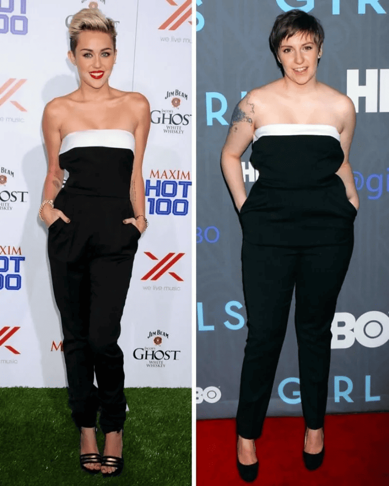 In the battle of the pantsuit, Miley Cyrus and Lena Dunham made a lasting impression with this striking ensemble. Miley went for a slightly baggy fit, while Lena opted for a more fitted look. Both embraced the casual, hands-in-pockets pose for photos. The all-black pantsuit is both slimming and bold, with a white stripe across the top, adding extra flair. Both celebrities kept their jewelry minimal, with Miley sporting only one bracelet on each wrist for the occasion.