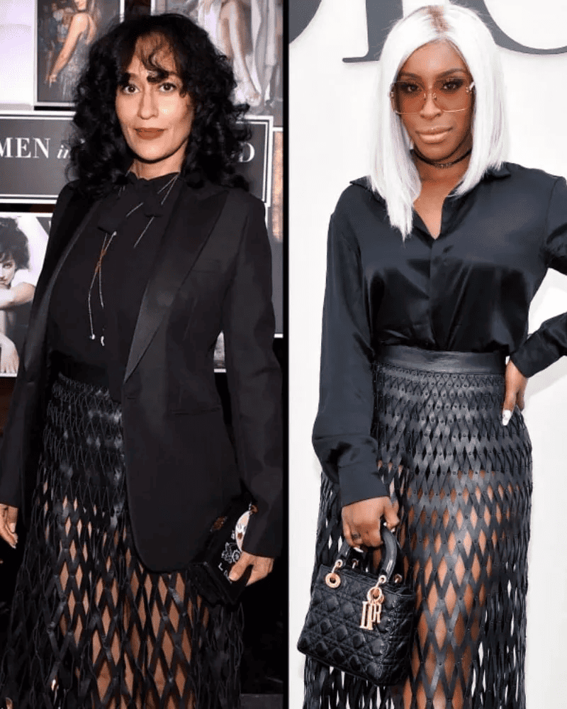 This distinctive black skirt is designed to make a statement with its woven pattern and versatile black color. Tracee Ellis Ross paired it with a black top and jacket, adding a touch of gold with a necklace and clutch. On the other hand, Jackie Aina opted for a black dress shirt, neatly tucked in for a more professional look and a statement bag. Both women showcased an all-black style that exuded sleekness and sophistication.