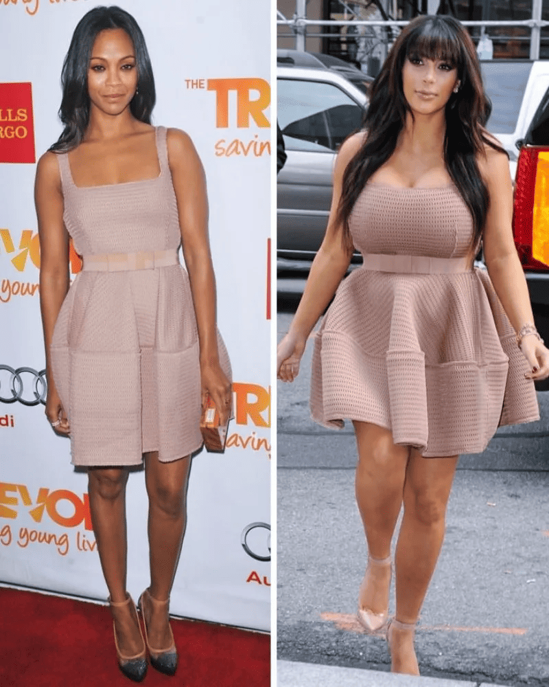 Zoe Saldana and Kim Kardashian demonstrated their unique approaches in a chic mauve-colored dress featuring casual straps, a straight neckline, a cinched waist, and a full skirt. Zoe wore the dress for an event, while Kim chose to wear it casually for a stroll. They paired the dress with strappy pumps and let their long dark hair complement the shoulder-baring style. It’s a versatile dress that suits different occasions.