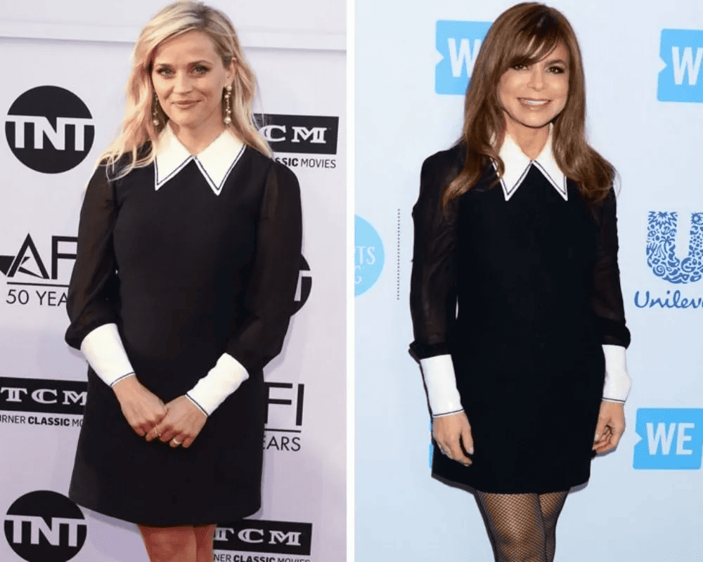 This playful outfit with schoolgirl or nun-inspired elements brings a touch of fun to fashion. The black dress with white accents creates a distinct style. Reese Witherspoon paired hers with pearl and gold earrings, maintaining a classic look. Paula Abdul added a twist with fishnet-style stockings. The result is a demure dress that maintains an edgy vibe, allowing both celebrities to showcase their style.