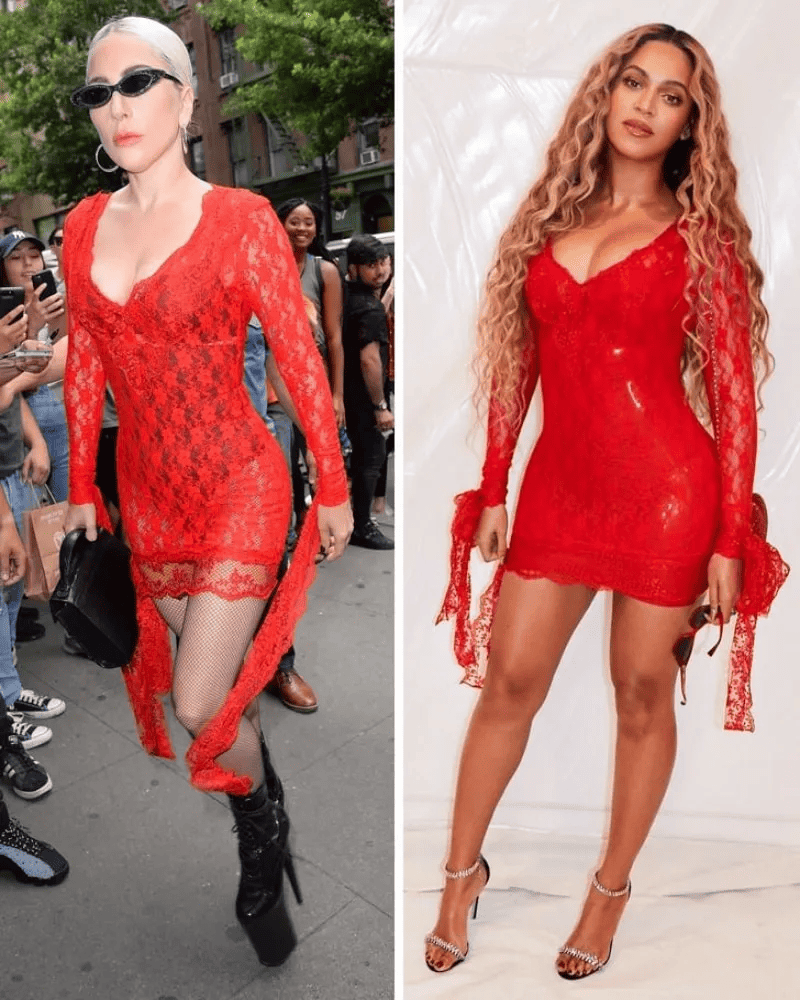 This see-through red dress exudes a unique flair, and Lady Gaga and Beyonce embraced it in their ways. Lady Gaga wore a black bodysuit under the sheer dress and added chunky boots, stockings, small sunglasses, and hoop earrings to create a bold, avant-garde look. In contrast, Beyonce went for an all-red ensemble, with strappy silver heels and her signature curls cascading down her shoulders. The dress served as a canvas for both celebrities to express their styles.