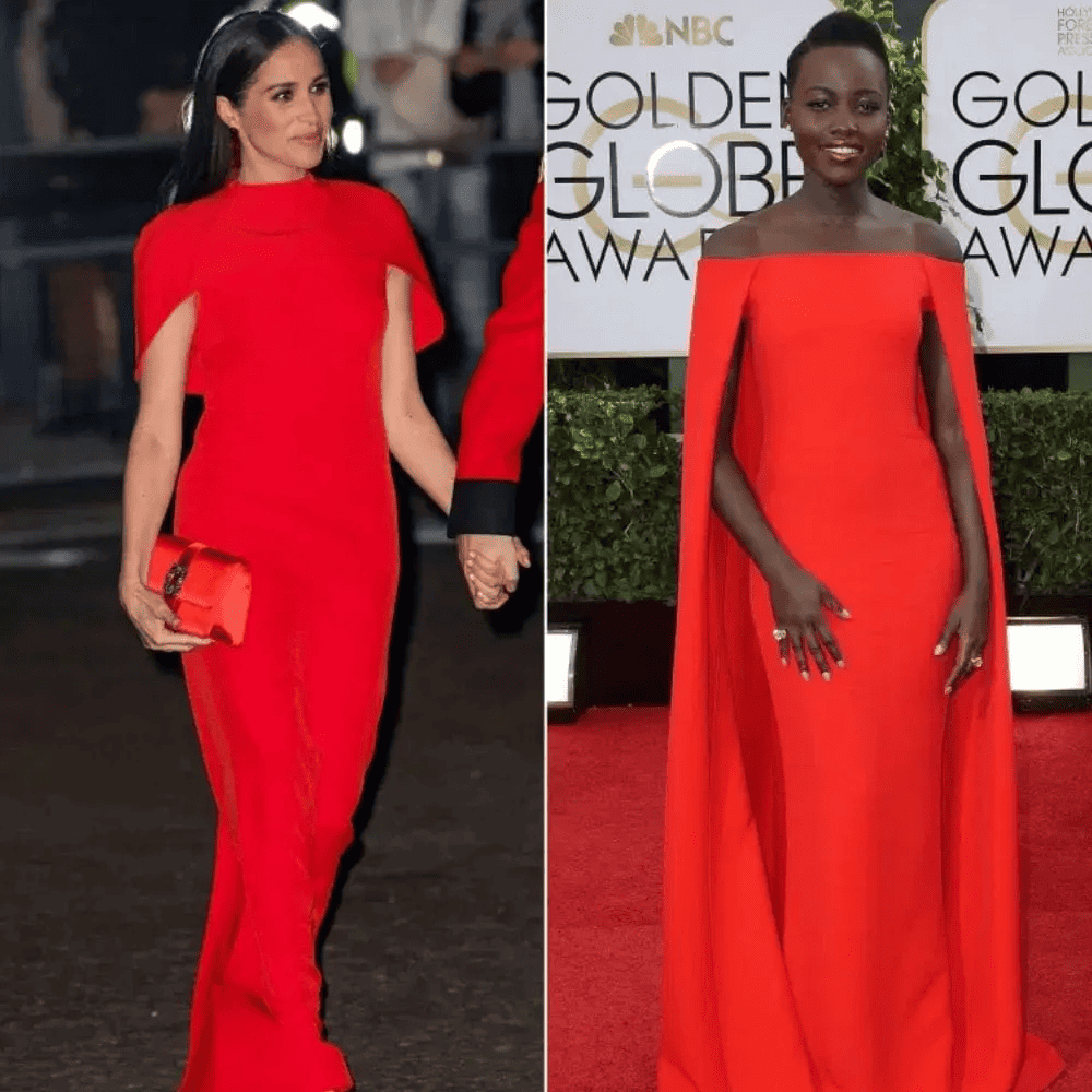 The Duchess of Sussex, Meghan Markle, and Oscar-winning actress Lupita Nyong’o both chose to wear striking red caped dresses to different events. Meghan donned a red Safiyaa dress at a music festival in 2020, reminiscent of Lupita’s 2014 Ralph Lauren dress. While the designers differed, the dresses shared similar lines and shapes, prompting comparisons between the stunning women.
