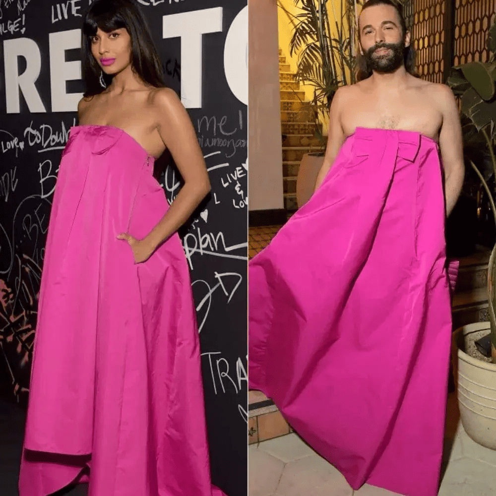 Jonathan Van Ness, a Queer Eye star, graced the Netflix Creative Arts Emmy’s afterparty in a striking fuchsia trapeze dress designed by Rochas. British comedic actress Jameela Jamil wore the same dress at a YSL party in late 2019. Jameela humorously admitted on Twitter that Jonathan wore it better.