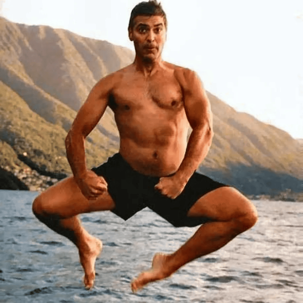 Even in the midst of a mid-air leap into the water, Clooney manages to exude an irresistible appeal that continues to captivate women, complete with a delightfully goofy expression. Perhaps it’s the way his arm muscles flex with grace and strength as he soars through the air or the impeccable precision with which he extends his toes, effortlessly showcasing his poise and athleticism. Despite the inherent awkwardness captured in this particular photograph, there is an undeniable charm emanating from the moment. Clooney’s ability to embrace his playful side, even in the most unconventional of poses, adds to his allure, creating an endearing visual that further solidifies his position as a timeless heartthrob.