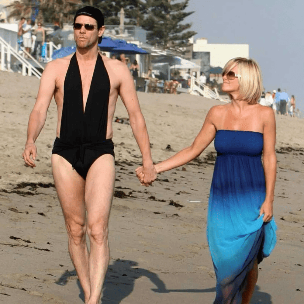 However, it pains us to be the bearers of this news, Jim, but it seems that the particular bathing suit you’ve chosen is simply not your best look. The color black doesn’t quite complement your vibrant persona, and the proportions of the garment fail to accentuate your unique physique in the most flattering manner. Nevertheless, it is undeniable that your fashion choice serves as a source of amusement, inviting a good-natured laugh from those who behold it. In true Carrey fashion, you bring joy even in the realm of fashion missteps, reminding us all that humor and lightheartedness can prevail even in moments of sartorial quirkiness.