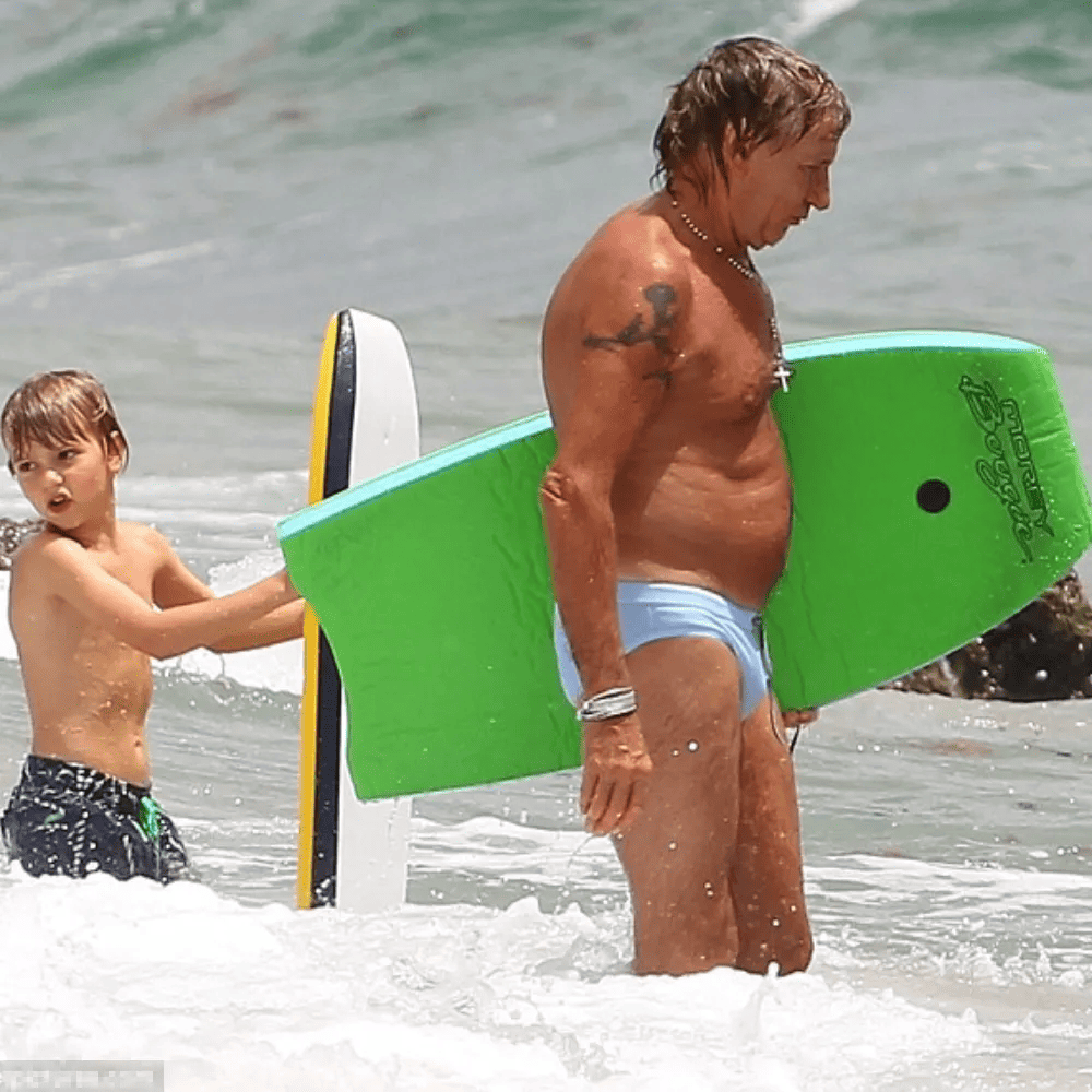 However, a slight misstep in Rod Stewart’s beach attire becomes evident in this scenario. The choice of baby blue Speedos, while a personal preference, falls short in terms of being an optimal swimsuit option. The critique is not directed towards Rod himself, but rather the style choice. Speedos, regardless of the wearer, tend to lack universal appeal and are generally regarded as less flattering. Their unconventional design often fails to complement various body types, resulting in a less-than-ideal aesthetic outcome. Despite this sartorial misjudgment, it is essential to acknowledge and appreciate Rod Stewart’s commitment to family time, as he sets an admirable example for fathers everywhere, highlighting the importance of being present and engaged in their children’s lives.