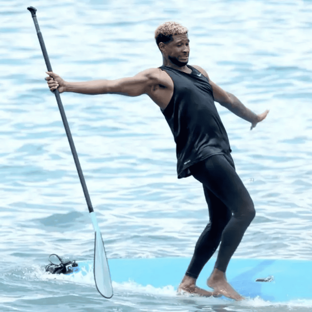 The paparazzi had a stroke of luck capturing a photo of Usher just moments before disaster struck and the singer took a tumble off his surfboard. Ironically, the image captures a moment that resembles Usher effortlessly executing a dance move atop his board.