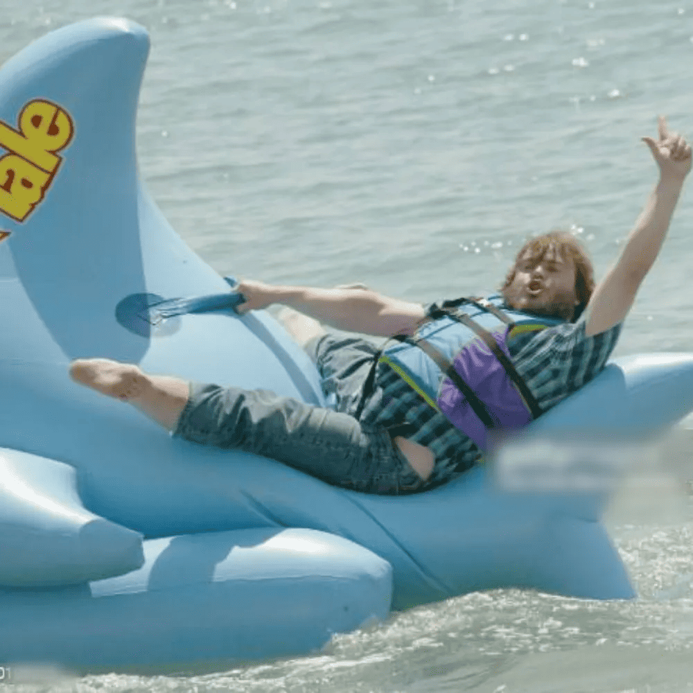 Jack Black is famous for his extraordinary sense of humor and multifaceted talents. He left an indelible mark in 2004 when he voiced the main characters in the animated film Shark Tale. Dng his tour, rather intriguing series of photographs uriemerged, featuring the star perched upon a colossal inflatable shark. In this particular image, one cannot help but wonder about Jack’s peculiar choice of attire. What exactly is he doing? Who, in their right mind, would dare wear jeans while venturing onto the water?