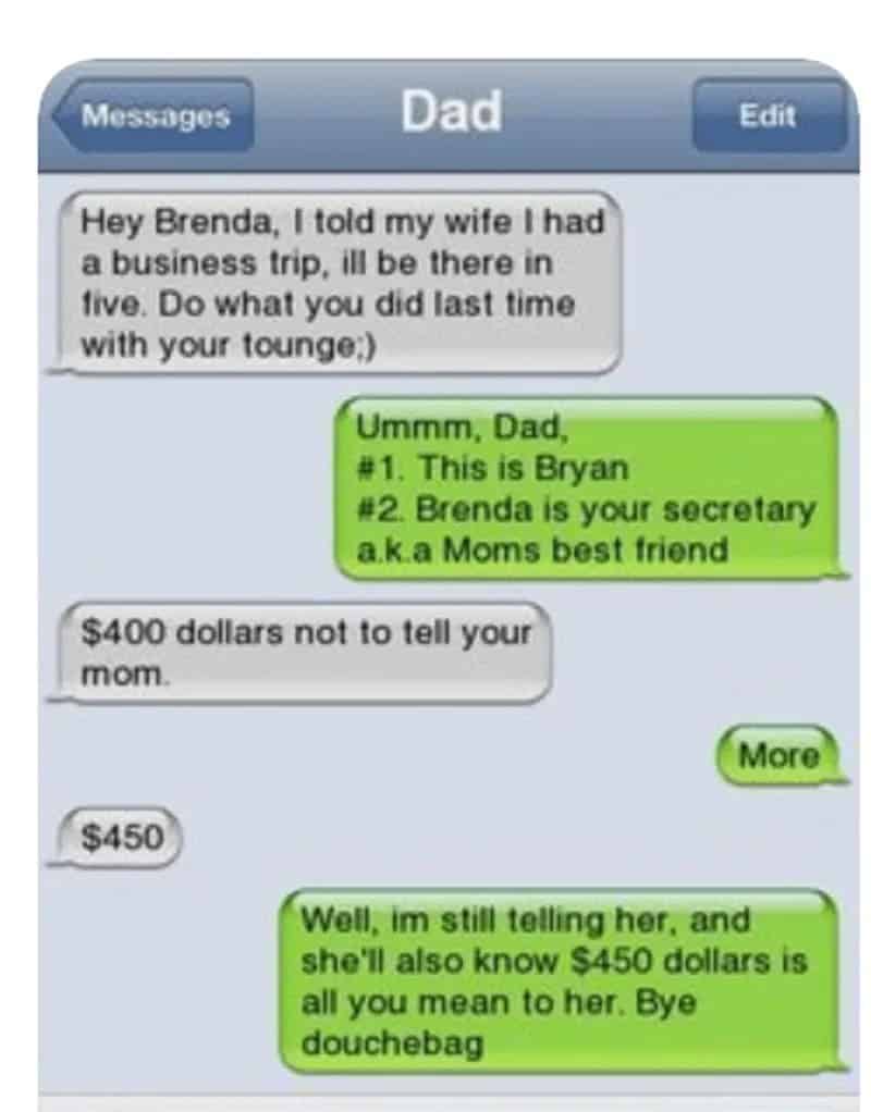 Instead, his son Bryan replied, asking for money. Bryan’s cool response: he’ll tell Mom that all she’s worth to Dad is $450!