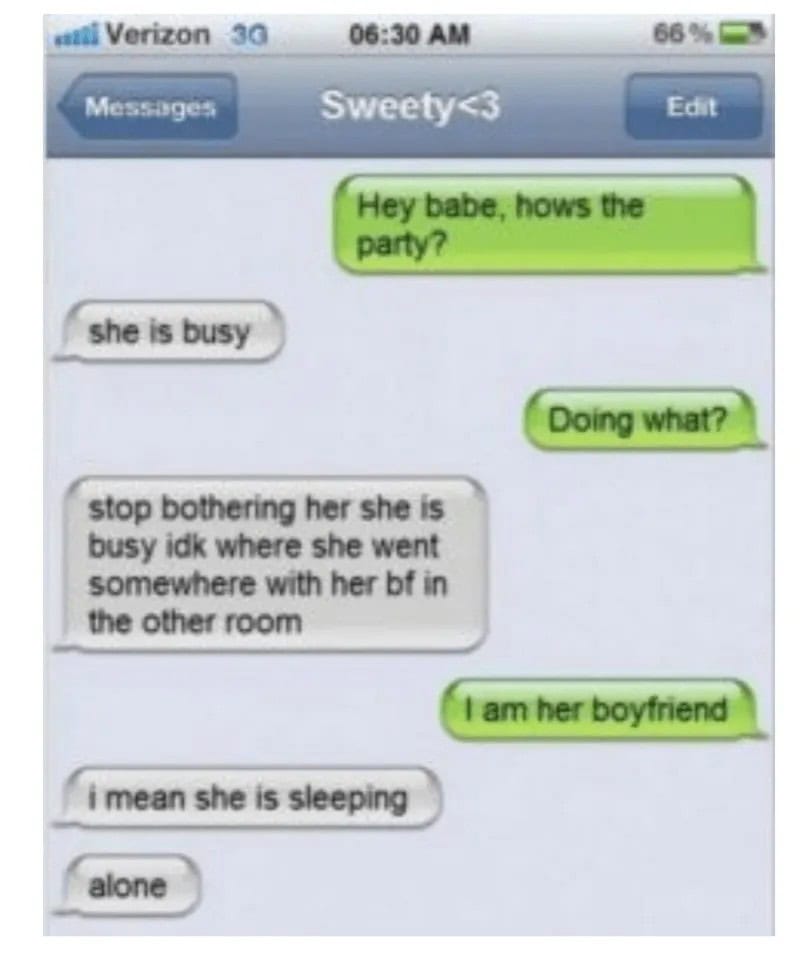 Sometimes, it’s better not to know everything. A guy asked his girlfriend about a party and got an unexpected response. Someone else replied, saying she was in another room with her boyfriend.