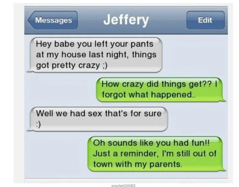 When things get crazy, be careful who you talk to. A girl told her boyfriend Jeffrey he left his pants at her place after a wild night.