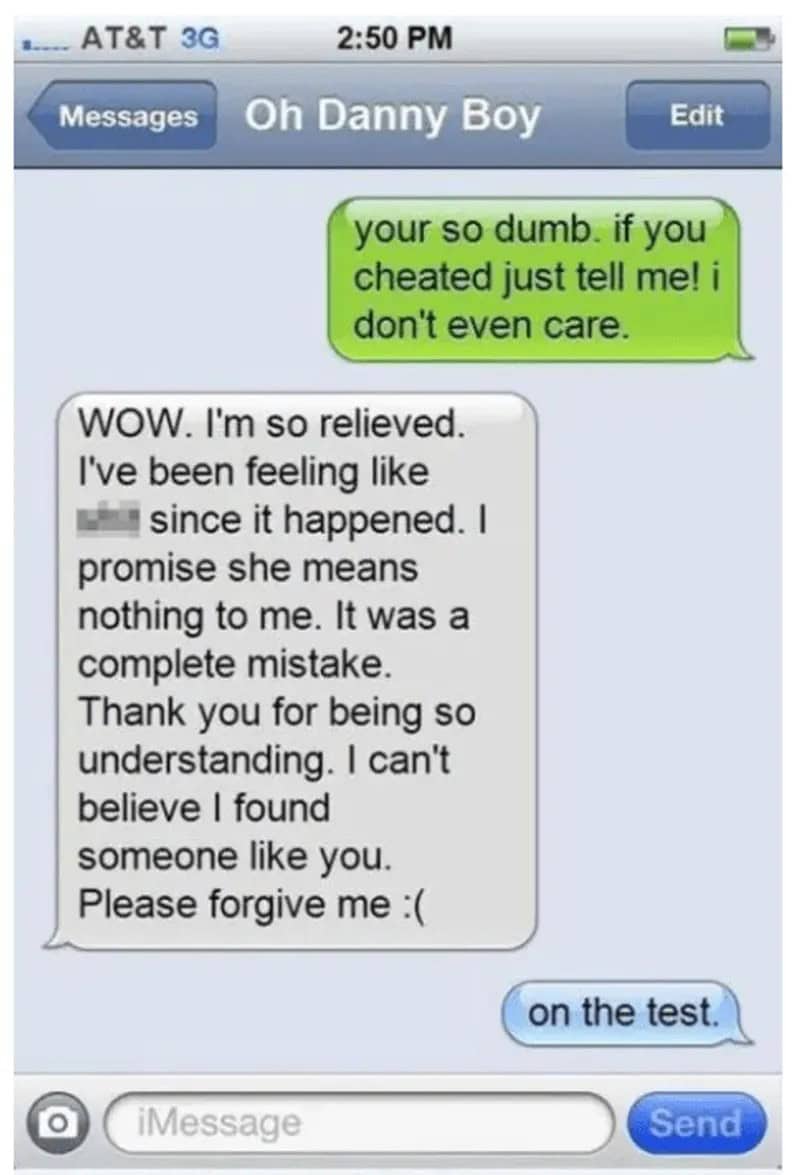 Finally, the boy took the bait and confessed to cheating on her, but she was only asking about a test. Well, that’s one way to end up single, Danny Boy!