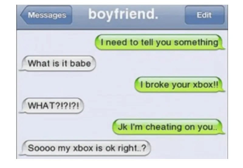 Sometimes, material things outweigh relationships. A boy learns his girlfriend broke his Xbox, but then she admits she cheated, and the Xbox is fine.