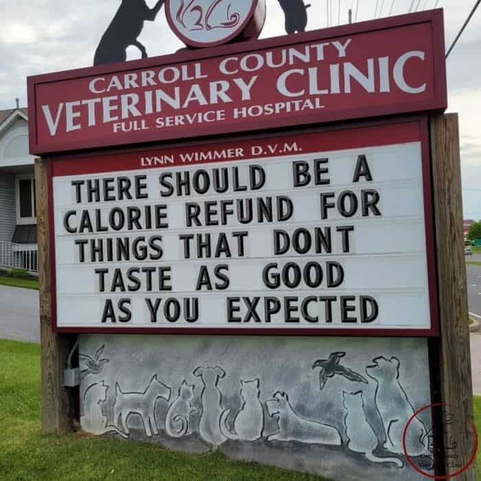 While the sign may not directly relate to pets, it touches upon the concept of calorie consumption, offering a humorous perspective many can appreciate. It’s another example of the clinic’s clever and witty messaging, prompting playful reflections on “calorie refunds” and how we sometimes wish we could control our diets.