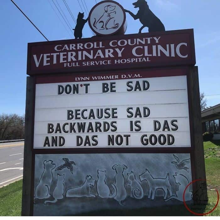 Dealing with sadness can be an overwhelming experience, and finding a way to break free from its grip is often a formidable challenge. Aside from the comforting presence of our pets, humor emerges as a powerful remedy during these tough times. The clinic’s sign combines wisdom and humor to offer a simple yet profound message.