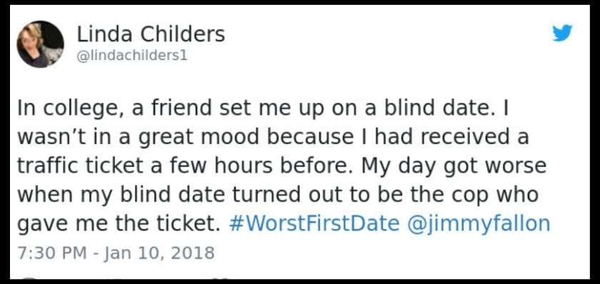 Linda was already having a rough day when she got pulled over and handed a traffic ticket. But she didn’t expect that the cop who wrote her up would also be the guy waiting for her at a blind date later that evening. That’s right — her friend had unknowingly set her up with the very same officer who had just ruined her day. Talk about timing.